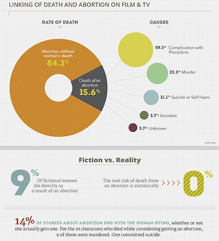 Even more jarring is this caveat is that the 9% figure applies only to characters who actually went through with their abortions. When the pool is widened to include characters who considered abortions, the number leaps to 14% of storylines ending in the woman's death. The researchers found 10 cases of characters who died while considering abortions that nine were murdered and one committed suicide.
