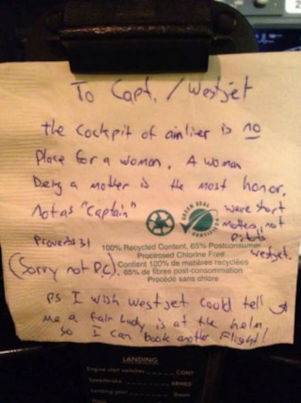 The female pilot of a WestJet flight from Calgary to Victoria used social media to respond to a sexist note that she believes a male passenger left for her recently on an airline napkin.
