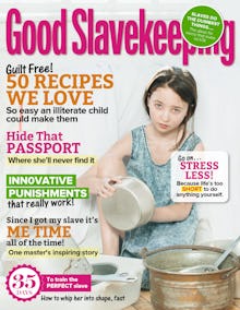 Good Housekeeping seems less innocuous when written for the benefit of slave owners. Cover features include, "Hide that passport where she'll never find it," "Innovative punishments that really work!" and "35 days to train the perfect slave: How to whip her into shape, fast." A chilling bonus badge reads, "Slaves do the dumbest things ... The pleas for mercy that make us LOL."