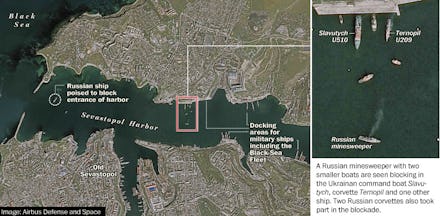 This first image shows Russia's naval blockade in Sevastopol Harbor, which has effectively trapped Ukrainians ships at the base. Russian forces also sank a decomissioned submarine in the harbor to create an obstacle for Ukrainian vessels.