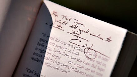 I was just a 17-year old kid from the Bronx with dreams of becoming a scientist, and somehow the world's most famous astronomer found time to invite me to Ithaca in upstate NY and spend a Saturday with him.I remember that snowy day like it was yesterday. He met me at the bus stop. He showed me his laboratory at Cornell University. Carl reached behind his desk, and inscribed this book (Cosmic Connection) for me:At the end of the day, he drove me back to the bus station. The snow was falling harder. He wrote his phone number, his home phone number, on a scrap of paper. And he said, “If the bus can’t get through, call me. Spend the night at my home, with my family.”I already knew I wanted to become a scientist, but that afternoon I learned from Carl the kind of person I wanted to become. He reached out to me and to countless others. Inspiring so many of us to study, teach, and do science. Science is a co-operative enterprise, spanning the generations. It's the passing of a torch from teacher to student to teacher. A community of minds reaching back from antiquity and forward to the stars.