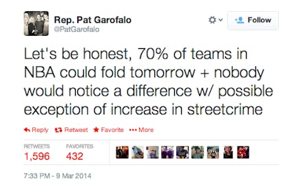 Garofalo’s tweet is especially dubious because it implicitly roots its racism in statistics. Even as he claims he's referring to the NBA's "generally high arrest rate," the congressman's reliance on numbers may incriminate him even further. For starters, there seems little doubt that his “70%” figure alludes to black Americans’ prevalence in the league. According to USA Today, 76.3% was the official black player count for 2012, a number slightly too close to Garofalo’s tweet figure to be coincidence.