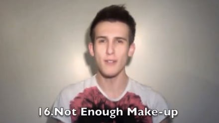 In fact, the video's creators manage to institutionalize the idea that being who you are as a woman is in some way annoying for men, and nothing you do can will make it better. For example, both "wearing makeup" and "not wearing enough makeup" are on the list.