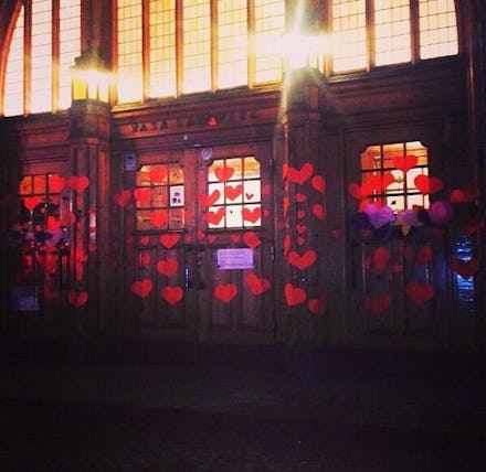 Among the cut out hearts and messages were signs reading, "Love overcomes hate" and "Love comes in all shapes and colors.”
