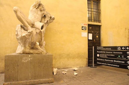 Security guards at the Academy of Fine Arts of Brera in Milan, Italy, were horrified to find this damage done to the statue on Tuesday morning. They later surmised based on witness testimony that the perpetrator was an unknown young student who posed on its lap for a photograph, after which a very certain "oh shit!" moment ensued. Or, more likely, santa merda!