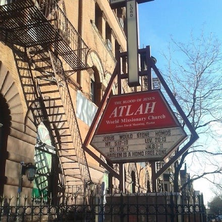 "Harlem is a homo free zone," the sign mistakenly said outside the ATLAH World Missionary Church in Harlem, New York. Quoting the infamous Leviticus 20:13 ("If a man has sexual relations with a man...") and Deuteronomy 17:5-7 ("Thou shalt stone them with stones..."), the sign also proclaimed, "Jesus would stone homos."