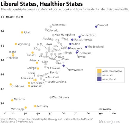 "Utah and Wyoming are two conservative states that do quite well on health measures, and they have very high levels of social capital or trust. By contrast, states like Mississippi and Kentucky have low social trust and high conservatism, and poor health outcomes."