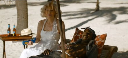 The super bizarre clip features Marilyn Monroe, Kurt Cobain, Tupac Shakur, Elvis Presley and Bruce Lee doing the respective cliches you'd associate with them even if you didn't speak English. An aging Monroe, ever the flirt, rubs sunscreen onto Tupac's "Thug Life"-tatted tummy. Cobain dons his white mod sunglasses to trade guitar riffs with John Lennon. Elvis says "thank you" seductively. The ad gets an A for American cultural literacy.