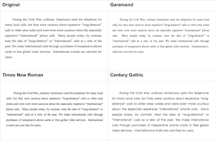 A 2012 government study recommended using Garamond, Times New Roman or Century Gothic, but Mirchandani found that Garamond was significantly more ink-efficient — and that Century Gothic was much worse than other fonts: