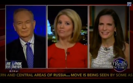 The video also features the now-infamous clip from February in which host Bill O'Reilly asks Fox News contributor and USA Today columnist Kirsten Powers and Republican strategist Kate Obenshain, "There's got to be some downside to having a woman president — something that may not fit with that office. Correct?"