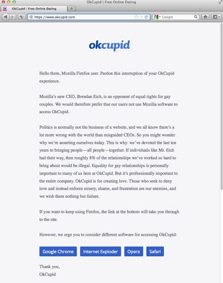 "Mozilla's new CEO, Brendan Eich, is an opponent of equal rights for gay couples," the message reads. "We would therefore prefer that our users not use Mozilla software to access OkCupid." There are links to access OkCupid through other browsers — Google Chrome, Internet Explorer, Safari, Opera — or to continue to the site through Firefox, though the option is guaranteed to make you pause for a bit.
