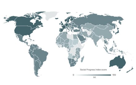 "It seems that basic human needs are actually most responsive to economic growth," Michael Green, executive director of the index, told Fast Company. "Economic growth gives you the basic stuff to feed a population, get basic shelter, get vaccinated. But on foundations of well-being, there's a slightly looser correlation."