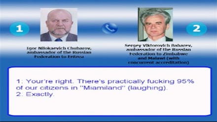 This incident might take the cake, though. A new recording has surfaced online, purportedly capturing a secret phone conversation between two Russian diplomats: Igor Chubarov — the ambassador to Eritrea — and Sergei Bakharev, the ambassador to Zimbabwe and Malawi. The two men curse (pretty explicitly) the UN's condemnation of the Russian annexation of Crimea, and trade jokes about where Russia can invade next.