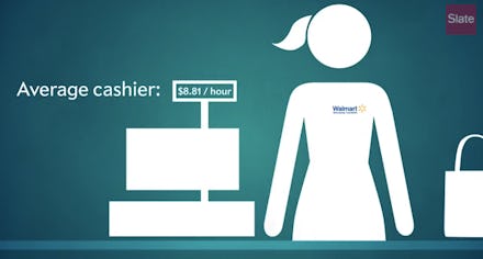 According to Slate's calculations, the average Walmart cashier is only paid $8.81 hour. The low wages have led a sizable chunk of Walmart employees to depend on food stamps — about 40 employees per store.