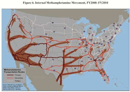The maps below show how cocaine, heroin, marijuana, MDMA (ecstasy) and meth enter into and travel around the United States. The maps are from an analysis by the U.S. Department of Justice National Drug Intelligence Center (NDIC). They illustrate NDIC's assessment of the primary, secondary and tertiary highway routes that traffickers predominantly used between 2008 and 2010, the most up-to-date data. The size of the arrows indicates the incidence and volume.