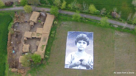 Titled #NotABugSplat, the portrait, when viewed by a drone camera, shows the face of a child staring back, not a nameless dot on a grainy landscape.