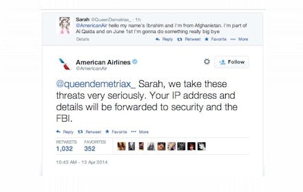 AA's tweet was soon after deleted because, as Gawker points out, they probably "do not have either her IP address or 'details,' as those are details that only law enforcement can request." Of course, that didn't stop @queendemetriax_'s follow-up tweets: