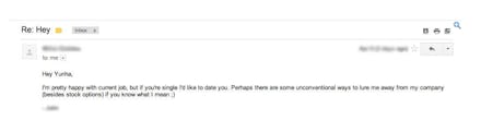 "Hey Yunha," the unidentified prospective hire writes. "I'm pretty happy with current job, but if you're single I'd like to date you. Perhaps there are some unconventional ways to lure me away from my company (besides stock options) if you know what I mean ;)."