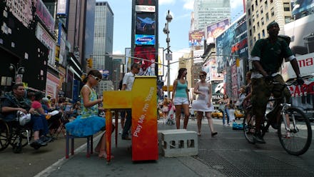 Musicians normally need permits to play outside, but the project eliminated that hassle. New Yorkers showed up in style to perform and enjoy. Up-and-coming musicians looking for their big breaks used them to create viral videos to promote their acts, like the one included above. Cindy Lauper staged a mini-concert on 42nd Street, decked out in all-black leather suit.