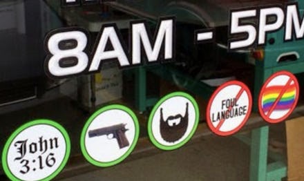 The storefront stickers represent the views of a local Kentucky business' bigoted owners, but should not be written off as an anomaly. Indeed, the fact that Herald Embroidery is perfectly within its rights to post such signage is part of a much wider problem. As of recent weeks, it's now legal for gun owners to walk unrestricted into Georgia bars, government buildings, schools and religious institutions. Meanwhile in Kentucky — where this print shop is located — its similarly legal use "religious beliefs" (including those that could undermine the civil rights of gays and lesbians) as a legal defense in court.