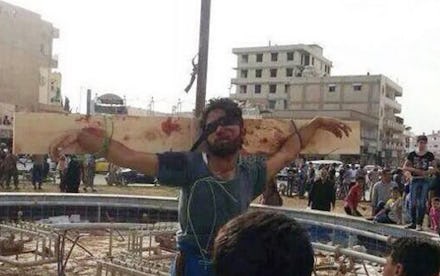 Islamic extremists in the country are now carrying out ghastly public crucifixions and broadcasting images of the torture across the Internet. "One of 7 people executed by ISIS in Raqqa today on charges of planting IEDs," reads one of the tweets recently posted to a jihadist account depicting some of these brutal executions.