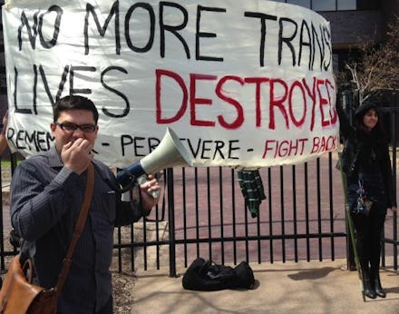 Propelled by the urgency of this situation, 50 protesters gathered on April 25 outside Connecticut's DCF headquarters, along with solidarity protesters who simultaneously gathered outside NYC's Administration for Children's Services. Organizers carried a bullhorn, a microphone and a large banner that read "No More Trans* Lives Destroyed." While Jane Doe's lawyer sat in tense negotiations with DCF, the crowd chanted "DCF! DOC! Jane Doe must go free!" and "Victim blaming? We say no! We want justice for Jane Doe!"