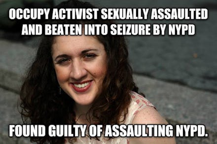 A 25-year-old named Cecily McMillan was convicted in court on Monday, the last of the 2,500 Occupy Wall Street protestors who have been moving through the criminal justice system since police arrested hundreds in a night-time raid on Zuccoti Park in 2012. Her crime: elbowing a cop named Grantley Bovell in the face after he allegedly groped her during the protests. According to a Manhattan jury, that was enough to convict her of second-degree assault of an officer, which is a felony that can lead up to seven years in prison. She was denied bail and taken to the Riker's Island jail, where she will await her sentencing.