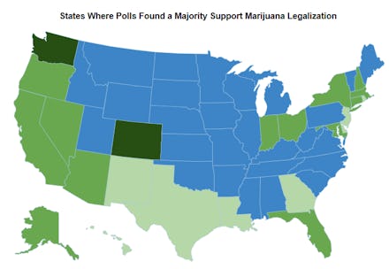 Medium green: States where at least one public non-partisan poll found a majority of adults and/or voters support marijuana legalization