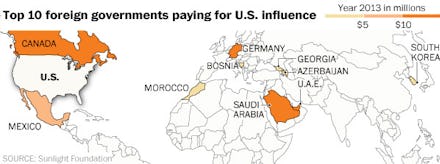 The background: Sunlight's Bill Allison told the Washington Post that for some countries, "It's like renting a diplomatic corps when they hire foreign agents," explaining that many of the listed nations lack strong diplomatic ties. But trade treaties and huge business deals like the Keystone XL pipeline can lead to lobbyists directly petitioning on behalf of a foreign government. And then there's energy interests, hence Dubai at the top of the list.