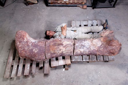 Based on the length and circumference of the dinosaur's femur (thigh bone), the crew calculated the animal weighed 77 metric tons, seven more than the previous largest dinosaur record holder, the Argentinosaurus. The creature would have been roughly 130 feet long and 65 feet tall and is believed to have been a species titanosaur — an enormous herbivore dating from the Late Cretaceous period (about 100 to 60 million years ago) notable for their small heads, long necks and long tails. The team believes this creature likely lived in the forests of Patagonia between 95 and 100 million years ago, based on the age of the rocks in which its bones were found.