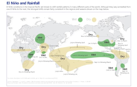 The designation "El Niño," according to the National Oceanic and Atmospheric Administration, "refers to the large-scale ocean-atmosphere climate interaction linked to a periodic warming in sea surface temperatures across the central and east-central Equatorial Pacific." Such events are responsible for disrupting typical weather patterns (often severely), and depending on where you live, El Niño can trigger anything from torrential rainstorms to severe drought. This usually happens every few years, but environmental scientists worry that climate change could increase the phenomenon's frequency.