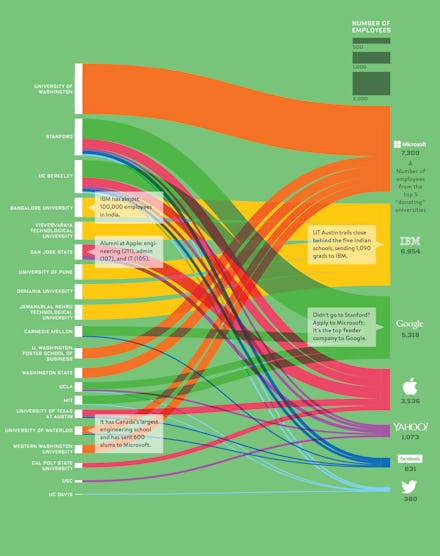 For those interested in a career in tech, Wired combed through countless LinkedIn accounts and put together this handy chart to illustrate where top American tech companies' recruits graduate from. Stanford seems like an obvious feeder school for the Valley, but you'd be surprised to learn that it's not the number one school on this list; in fact, it's the University of Washington, which is the biggest recruiting ground for Microsoft.