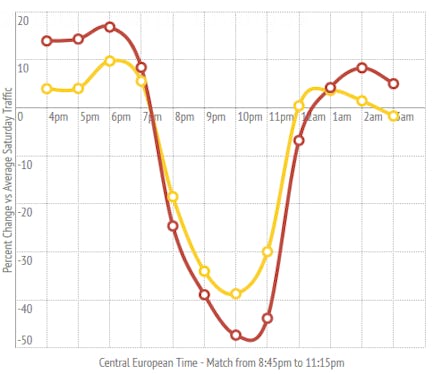 The match kicked off at 8:45 p.m. and ended at 11:15 p.m. Central European Time. Pornhub reported significant drops relative to its average Saturday night traffic across Europe, but nowhere was the difference more pronounced than in Madrid.