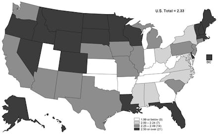 Alaska, Louisiana, Florida, Delaware and Washington, D.C. are all big drinking regions, as are the Northern states, with the average resident consuming over 2.5 gallons of ethanol in alcohol per year. The NIAAA report also found that overall, per capita ethanol consumption increased by 2.2% — only seven states experienced a decrease.