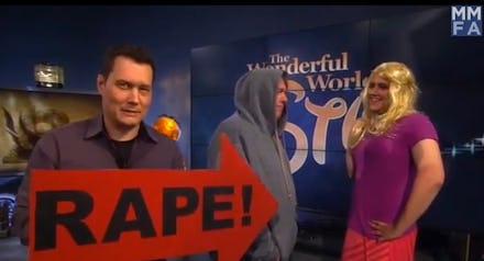 As this whole hilarious act is going on, Burguiere periodically interjects with a giant, red "RAPE!" arrow sign, spewing nonsense like: "Pressuring someone to have sex with you by telling them lies is the same as rape. ... Threatening to spread rumors to get sex is the same as rape ... Repeatedly asking for sex to get sex is the same as rape. That's persistence rape."