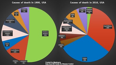 Clearly, scientific progress has made great leaps since 1900 (for example, it wasn't until 1901 that Karl Landsteiner discovered the existence of different human blood types). But perhaps nothing more clearly demonstrates this than our causes of death over time. Though terrible diseases like cancer and heart disease ravage the country, at least your doctor isn't prescribing you a course of bloodletting.