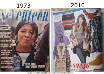 Bitch Media recently posted a photo to its Facebook page comparing a Seventeen cover from 1973 to one of the magazine's fashion spreads in 2010. Whereas the 41-year-old cover featured a natural-looking smiling Native American teenage girl and included a special report about "Today's Young Navajos," the more recent issue dressed a white girl in "sunset colors and woolly knits" for its so-called Navajo fashion spread.