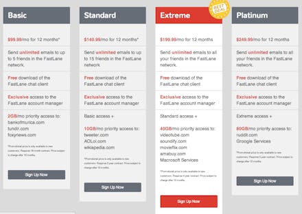 The satirical site tries to sell you web access with prices and restrictions right out of a Comcast executive's dream. It offers "priority access to dozens of websites" for plans starting at $99.99 a month ("send unlimited emails to up to 5 friends") to $249.99 a month. Each package comes with access to thinly veiled real web companies — you can get "tweeter.com" with the standard package but need to pay more for access to "movieflix.com" or "Groogle."