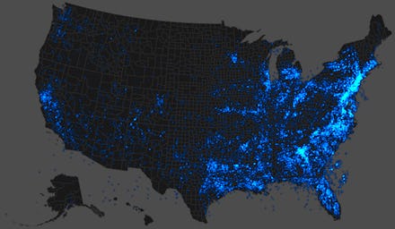 The map above animates black migration patterns around the U.S. and the constellation of bright spots is almost miraculous. Moving dots converge toward cities like Atlanta, Dallas and LA, economic hubs attracting African-American migrants in search of opportunity. The map provides a strong visual sense for the entrepreneurial spirit and optimism in the African-American community.