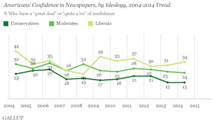 Political distinctions: The results of the survey differ significantly depending on the political affiliations of the respondents. Liberals, for instance, give newspapers a 34% confidence rating, compared to just 15% of conservatives. TV news goes the opposite way — only 15% of liberals trust what anchors tell them, compared to 18% of conservatives (and 19% of moderates).