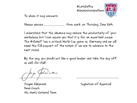 Fear not, because you can have your own personalized excuse from work, courtesy of U.S. coach Jurgen Klinsmann. It has a signature and everything, so we are pretty sure this is sanctioned by the U.S. government and is completely official.