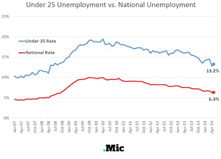 Many young adults, whether they’re living with their parents or on their own, struggle to find work. The unemployment rate for young adults (13.2%) has come down from it’s peak (19.5%), but it’s still higher today that it was before the recession.