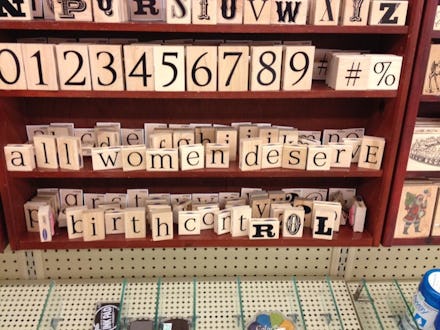 "We had been taking photos of some of the more interesting crafts on the shelves around the store, and I saw those stamps sitting there. It just seemed like a perfect opportunity to stage a kind of a silent protest, and the chance to use Hobby Lobby's own products to do it was just too serendipitous to pass up," Peck told Mic. "I certainly don't want to encourage other people to ransack their local Hobby Lobby, but who am I to tell other people what to do with things like stamps, stencils, lawn signs, window decals and other items that can be used to spell things out in the aisles?"