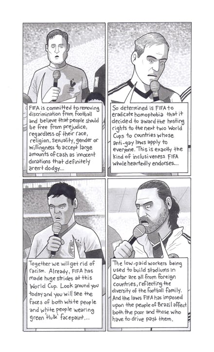 Second: The next panel is a stab at FIFA's hypocritical stance on homophobia. In expressing its commitment to "eradicating" this form of bigotry, the organization fails to see the irony in awarding the next two World Cups to Russia (2018) and Qatar (2022), two nations whose records on LGBTQ rights are far from sterling.
