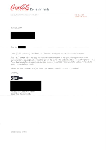 What happened? The most likely explanation is that some Coke intern accidentally used the wrong template, given the fact the Redditor's letter mentions nothing about "not qualifying for the FIFA World Cup." While this may be an isolated incident of bad customer service, Coca-Cola's general response to the allegations facing Qatar has been less than satisfactory.