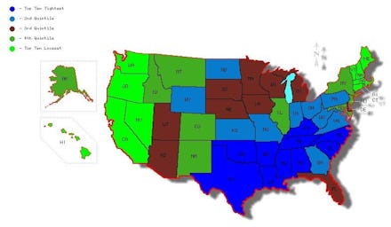 While not creating any definitive links yet, the results do make sense from an ecological and historical perspective. Liberal America's Rob Groce pointed out a pattern in the rankings that tracks fairly neatly with the electoral results from the last few presidential elections. According to Groce, it's no coincidence that the Northeast and West regions that elected President Barack Obama easily also generally fall into the loose category, while the more Republican-loyal South is clearly tight.