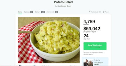 Unless you've been trapped under a WiFi-less rock, you're likely aware of the viral crowdfunding campaign by Zack Danger Brown, a genial enough-seeming fellow who has never made potato salad, and thought he'd like to give it a try. As any entrepreneurial young person is wont to do, he took to the Internet to make his potato salad dreams come true. Specifically, he took to Kickstarter, once used to lend a leg up to struggling artists and currently helping a man in Ohio make a mayo-based, starchy barbecue side.
