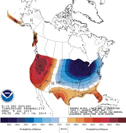 Here’s how it works: Because it’s so large, Neoguri will transform the power source for most of the weather in the northern part of the planet. As a result, the storm will push the jet stream much farther north than it typically reaches, creating a ridge of wind. On the other side of the ridge, the stream will get pushed farther south, creating a valley. While the west coast will get heat from the ridge, the east coast — sheltered inside a pocket of low temperatures in the valley — will see colder-than normal days.