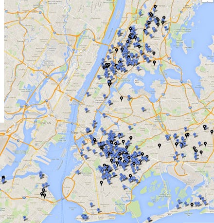 "Black markers indicate fatal shootings, blue markers indicate nonfatal shootings. Top shooting precincts are 73 (Brownsville, Brooklyn) and 47 (Williamsbridge and Wakefield, Bronx)Sources include NYCityAlerts, NYScanner, NY Daily News, NY Post, NY1 news, DNAInfo."