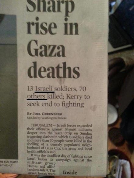 The news: Cairo-based photojournalist Mosa'ab Elshamy caught this headline from the Monday edition of the Baltimore Sun that seems to capture Palestinian sympathizers' frustration with mainstream media coverage of the ongoing conflict in Gaza. While Israeli combat fatalities are given up-front attention, Palestinian fatalities are brushed off as "others."